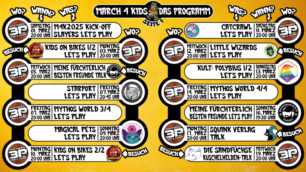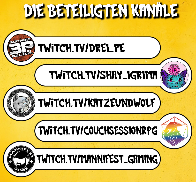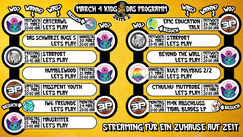 Auch in 2025 streamen wir, gemeinsam mit einigen befreundeten Kanälen, wieder den ganzen März über, um Kinderrollenspiele bekannt zu machen, über sie zu sprechen und euch tolle Leute und Aktionen rund um Kinderrollenspiele vorzustellen. Nebenbei sammeln wir wieder Spenden für das Ronald McDonald-Haus in Lübeck, wo die Familien schwerkranker Kinder während deren Behandlung kostenlos ganz nah bei ihren Kindern wohnen können. Wir freuen uns über Beteiligung oder eine Spende von euch, aber natürlich auch, wenn ihr einfach einschaltet und uns in den Streams Gesellschaft leistet.